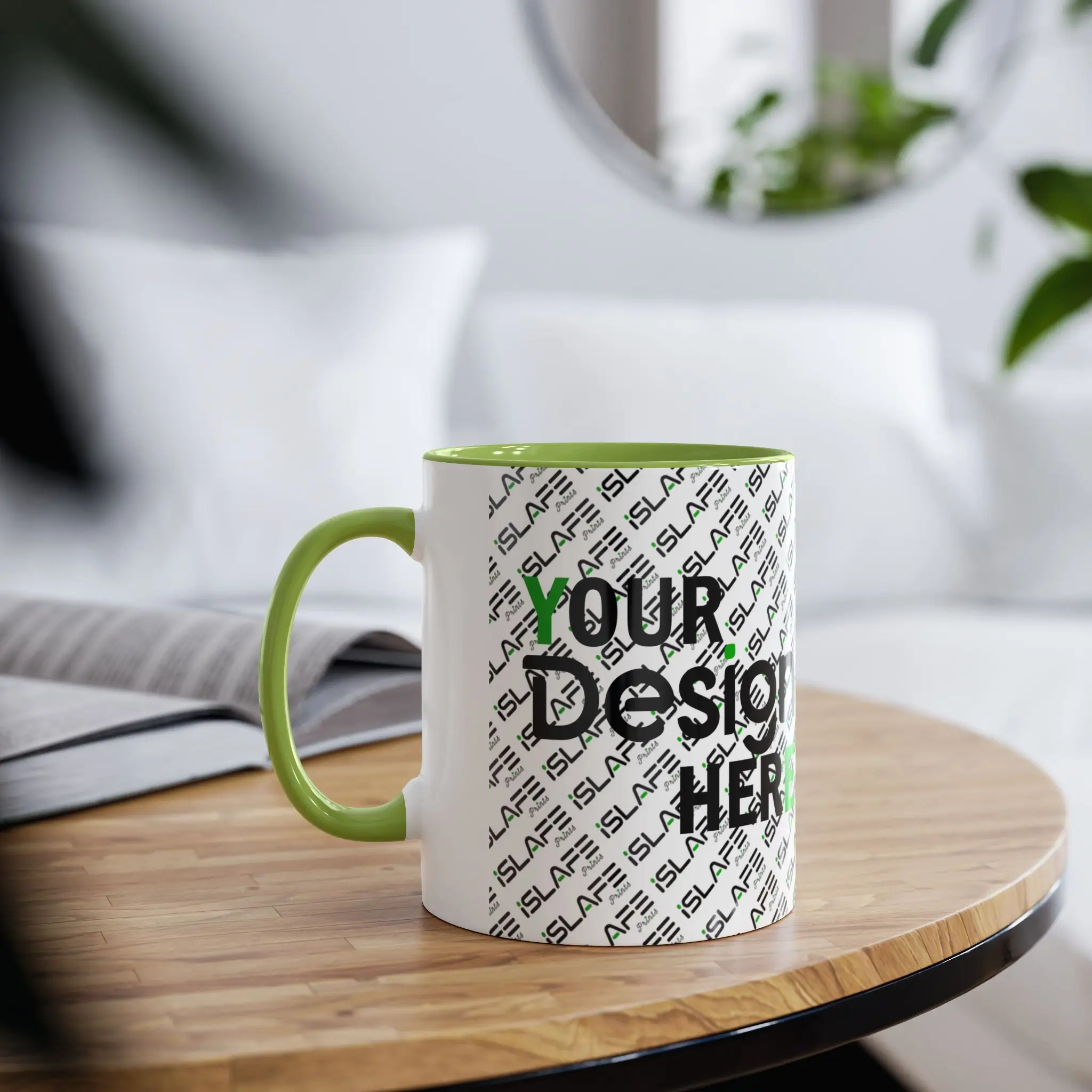 The Islafe Prints Accent Coffee Mug (11oz) combines clean white ceramic with a vibrant colored interior and handle—creating a mug that feels personal, expressive, and premium.
